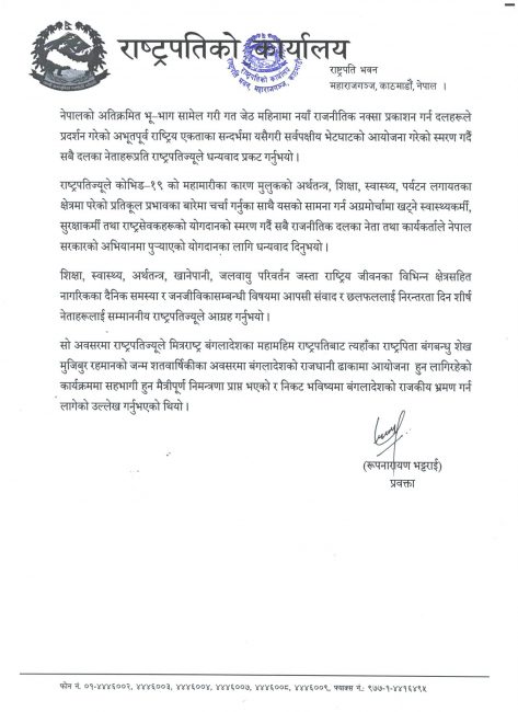 वर्तमान राजनीतिक गतिरोधबारे बोल्दै राष्ट्रपति भण्डारीले दलहरुलाई मिलेर जान सुझावसमेत दिएकी छन्। उनले सबै दलहरु मिलेर देश विकासमा लाग्नुपर्ने सुझाव दिएकी थिइन्। बंगलादेश भ्रमणबारे बोल्दै राष्ट्रपति भण्डारीले आफ्नो राजकीय भ्रमणका अवसरमा कोरोनाका असर, जलवायु परिवर्तनको विषयमा केन्द्रित हुने बताएकी थिइन्।
