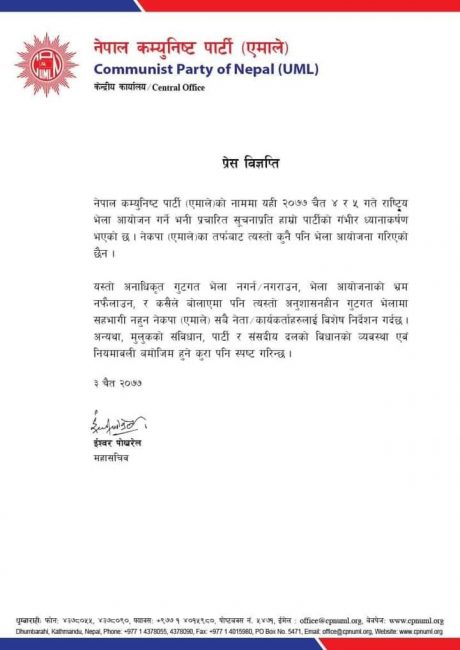 महासचिब ईश्वर पोखरेलले मंगलबार साँझ एक विज्ञप्ति जारी गर्दै एमालेले कुनै भेला आयोजना नगरेको भन्दै गुटगत भेला रोक्न भनेका छन्। विज्ञप्तिमा गुटगत भेलामा सहभागी नहुन नेता तथा कार्यकर्ताहरुलाई निर्देशनसमेत दिएको छ।
