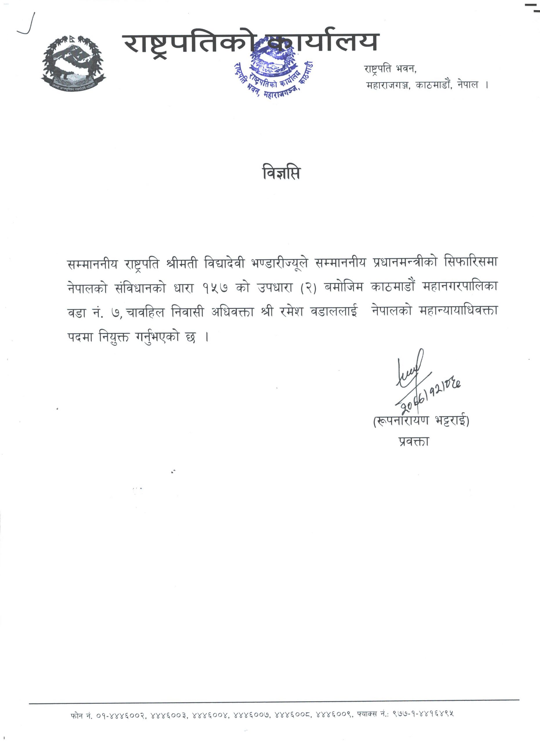 यसअघि राष्ट्रपतिसमक्ष प्रधानमन्त्रीमार्फत महान्यायाधिवक्ता अग्निप्रसाद खरेलले आजैदेखि लागु हुने गरी पदबाट राजीनामा दिएका थिए । राष्ट्रपतिले खरेललाई महान्यायाधिवक्ताका हैसियतले गरेको कार्यसम्पादनप्रति धन्यवाद व्यक्त गरेकी छन् । नवनियुक्त महान्यायाधिवक्ता बडालको शपथ आइतबार हुने जनाइएको छ ।