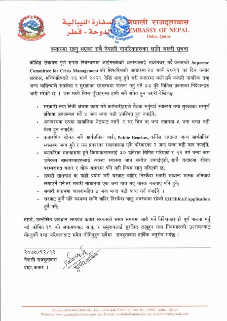 संक्रमण नियन्त्रणका लागि जारी गरेको सो निर्देशनलाई कतारस्थित नेपाली दूतावासले पनि पूर्ण पालना गर्न र कोभिड–१९ को संक्रमणबाट आफू र समुदायलाई सुरक्षित राख्न नेपाली समुदायलाई विज्ञप्तिमार्फत आग्रह गरेको छ।