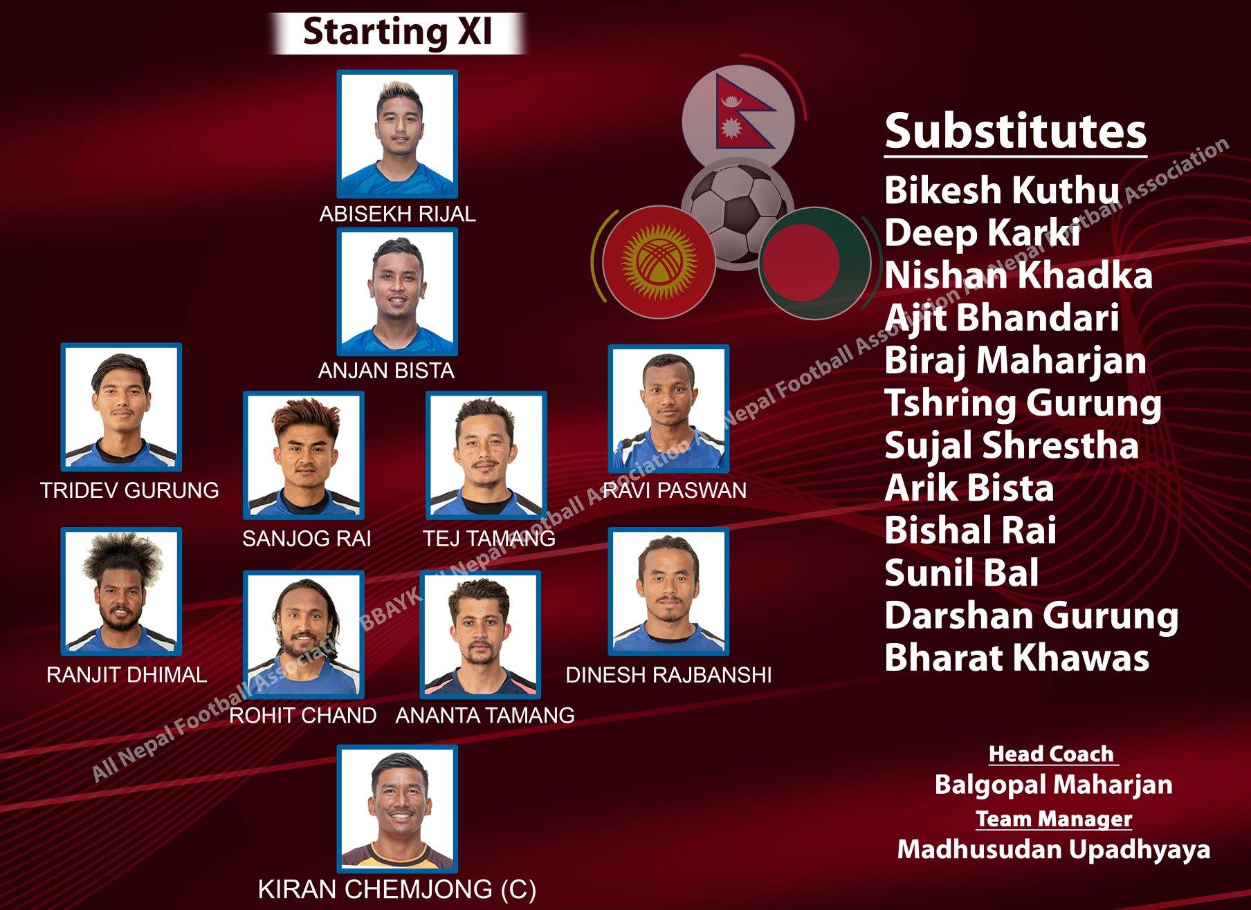 बंगलादेशविरुद्ध नेपालले किर्गिस्तानसँग खेलेको सुरुवाती–११लाई निरन्तरता दिएको छ ।