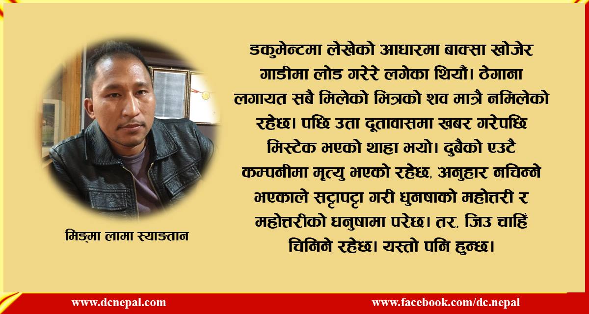 उनले अगाडि भने, ‘डकुमेन्टमा लेखेको आधारमा बाक्सा खोजेर गाडीमा लोड गरेरे लगेका थियौं। ठेगाना लगायत सबै मिलेको भित्रको शव मात्रै नमिलेको रहेछ। पछि उता दूतावासमा खबर गरेपछि मिस्टेक भएको थाहा भयो। दुबैको एउटै कम्पनीमा मृत्यु भएको रहेछ, अनुहार नचिन्ने भएकाले सट्टापट्टा गरी धुनषाको महोत्तरी र महोत्तरीको धनुषामा परेछ। तर, जिउ चाहीँ चिनिने रहेछ। यस्तो पनि हुन्छ।’