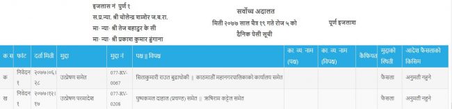 नेकपा एमाले र नेकपा माओवादी केन्द्रबीचको एकता बदर गर्ने सर्वोच्च अदालतको आदेशमा पुनरावलोकन नहुने अदालतले फैसला गरेको छ । प्रधानन्यायाधीश चोलेन्द्र शमशेर राणा नेतृत्वको पूर्ण इजलासले पुनरावलोकन नगर्ने आदेश दिएको हो । पूर्ण इजलासमा न्यायाधीशहरु तेजबहादुर केसी र प्रकाश कुमार ढुंगाना सदस्य थिए ।
