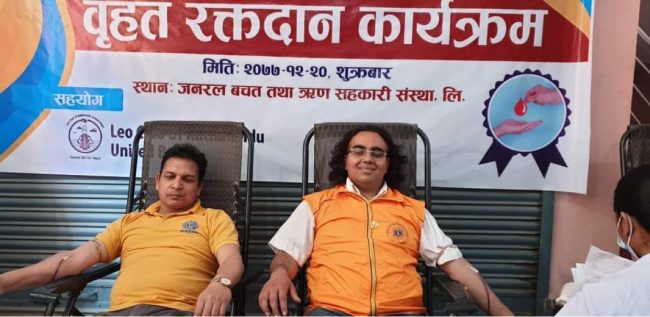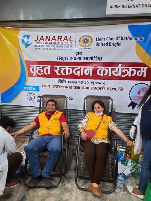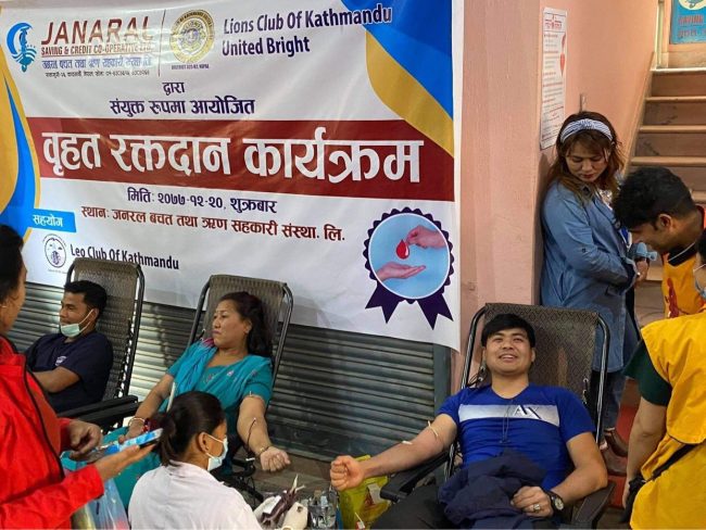 काठमाडौं । जनरल बचत तथा ऋण सहकारी संस्था र लायन्स क्लब काठमाडौं युनाइटेड ब्राइटले आयोजना गरेको रक्तदान कार्यक्रममा ८३ प्वाइन्ट रगत संकलन भएको छ। संस्थाले नयाँ वर्षको पूर्वसन्ध्या तथा सहकारी दिवसको अवसरमा रक्तदान कार्यक्रमको आयोजना गरेको थियो।