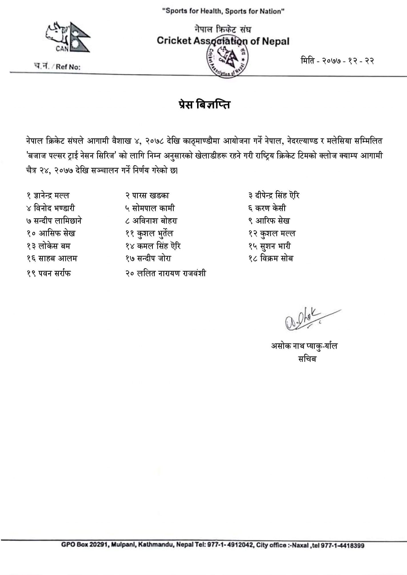 त्रिकोणात्मक टी–ट्वान्टी सिरिजको लागि प्रारम्भिक टोलीको घोषणा