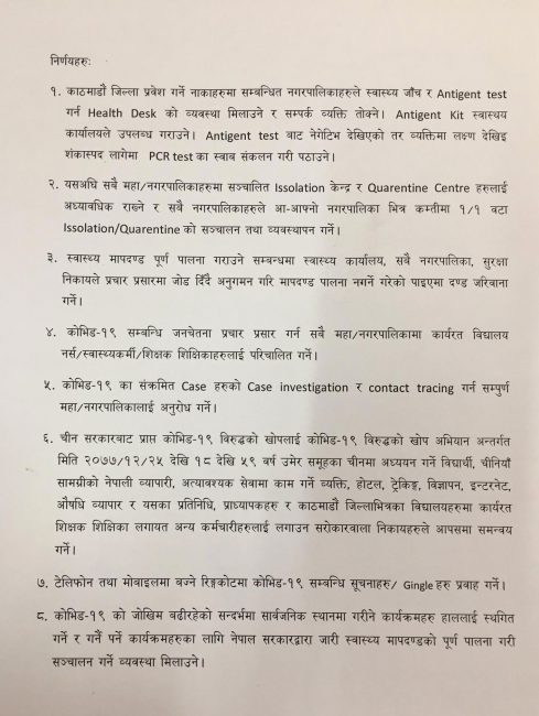 उनले नाकामा पर्ने स्थानीय तहहरुले उपत्यका प्रवेश गर्ने व्यक्तिहरुको एन्टिजेन परीक्षण गर्ने र एन्टिजेन नेगेटिभ देखिएको तर व्यक्तिमा लक्षण देखिइ शंकास्पद लागेमा पिसीआर परीक्षण गर्ने निणर्य गरेको बताए।