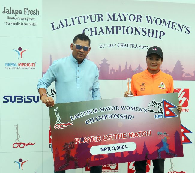 एपीएफले विना कुनै विकेट गुमाई ६७ रनको लक्ष्य सहजै पुरा गर्यो । टोलीका लागि ओपनर राजमती ऐरीले ३१ बलमा ४ चौंकाको मद्दतले अविजित ३३ रन बनाईन । अर्का ओपनर ईन्दु बर्माले पनि २४ बलमा ३ चौंकाको मद्दतले २८ रन बनाईन । खेलको म्यान अफ द म्याच एपीएपकी बिनु बुढा मगर भईन ।