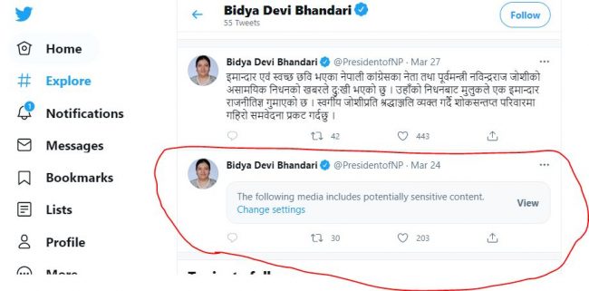राष्ट्रपति भण्डारीको ट्वीटलाई ट्वीटरले सेन्सर लगायो !