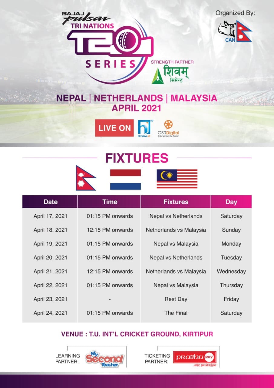टियु क्रिकेट मैदानमा आयोजना हुने सिरिजमा नेपाल, नेदरल्यान्ड्स र मलेसियाले खेल्ने छन् । नेपाल र नेदरल्यान्ड्सबीचको पहिलो खेल बैशाख ४ गते दिउँसो १ः१५ बजे सुरु हुनेछ ।