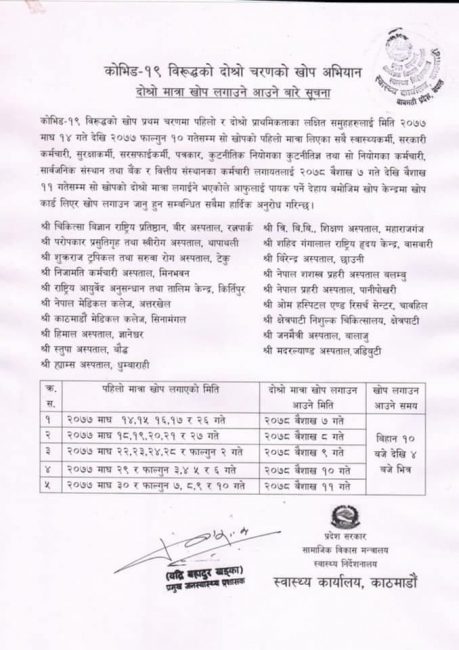 स्वास्थ्य कार्यालय काठमाडौंले मंगलबार एक सूचना जारी गर्दै कोरोनाविरुद्धको खोपको दोस्रो डोज लगाउने स्थान र मिति सार्वजनिक गरेको हो।