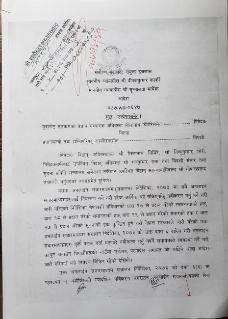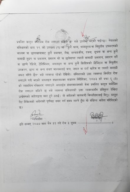 सर्वोच्चले अनलाइन संचारमाध्यम म्यादभित्र नवीकरण गराउने अनलाइन संचारमाध्यमको सेवा प्रचलित कानुन बमोजिम रोक लगाउन सकिने छ भन्ने ब्यवस्था संविधानसँग बाझिएकाले उत्प्रेषणको आदेश द्वारा बदर गरिदिएको हो ।
