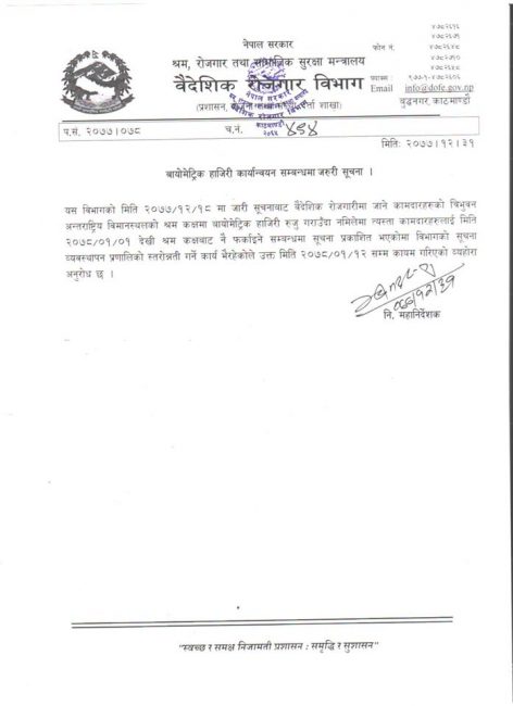त्यस्तै, बायोमेट्रिक हाजिरी नमिल्दा वैदेशिक रोजगारसम्बन्धी कानुन तथा अन्य आवश्यक जानकारी र सुविधाबाट वञ्चित हुनुको साथै सुरक्षित रोजगारी तथा अन्य हकअधिकारका विषयबाट वञ्चित हुने भन्दै बायोमेट्रिकको क्रसचेक गर्ने विभागको भनाइ छ ।