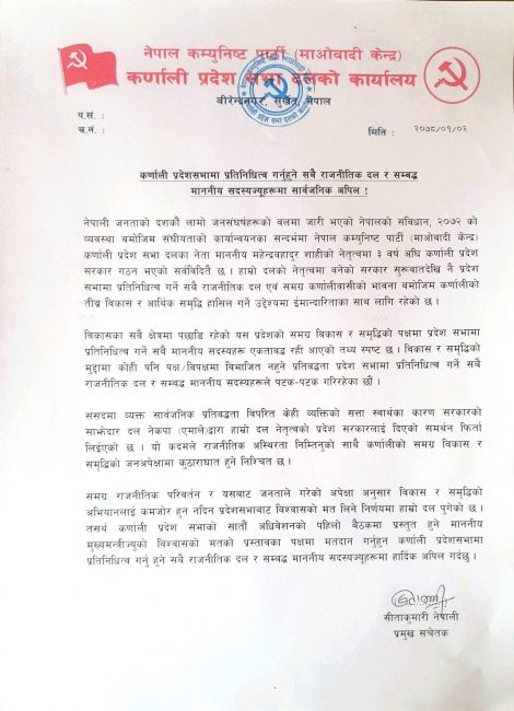 अर्कोतर्फ ६ सिट रहेको काँग्रेस र एक सिट रहेको राप्रपासँग पनि बिहीबार साँझसम्म माओवादीको कुनै सहमति भइसकेको छैन। १२ सिट रहेको माओवादी केन्द्रले आफ्नो सरकार बचाउन सक्ने कुनै अवस्था नदेखिएका बेला बिहीबार साँझ एक अपील जारी गरेको छ।