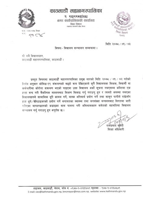 ‘कुनै विद्यालयका शिक्षक, विद्यार्थी वा कर्मचारीमा कोरोना संक्रमण भएको पाइएमा उक्त विद्यालय अर्को सूचना नभएसम्म कम्तीमा एक हप्ता बन्द गरी वैकल्पिक माध्यमबाट शिक्षण सिकाइ गर्नु गराउनु हुन र त्यस्तो अवस्था नभएका विद्यालयहरूले सामाजिक दूरी कायम गर्ने, मास्क अनिवार्य प्रयोग गर्ने तथा साबुन पानीले राम्रोसँग हात धुने/ सेनिटाइजरको प्रयोग गर्ने लगायतका मापदण्डहरूको कडाइका साथ पालना गरी अभिभावकहरू समेतको सहमतिमा विद्यालय सञ्चालन गर्नु/गराउनुहुन अनुरोध छ,’ महानगरको शिक्षा विभागका शिक्षा अधिकारी रामप्रसाद सुवेदीद्वारा हस्ताक्षरित पत्रमा उल्लेख छ।