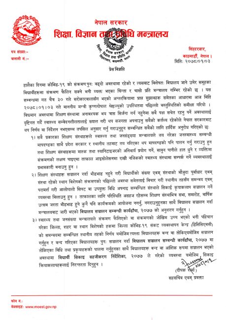 विद्यालय सञ्चालनबारे शिक्षा मन्त्रालयको ३ बुँदे निर्देशन, स्थानीय तहले विद्यालय बन्द गर्न सक्ने