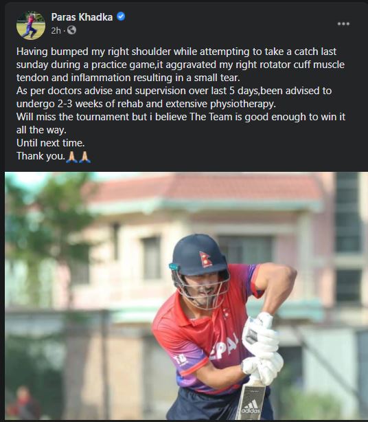 काठमाडौं । नेपाली राष्ट्रिय क्रिकेट टिमका सदस्य पारस खड्काले त्रिकोणात्मक टी–ट्वान्टी क्रिकेट सिरिज गुमाउने भएका छन् ।
