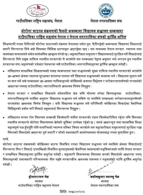 काठमाडौं । नेपाल नगरपालिका संघ र गाउँपालिका महासंघले कोरोनाको महामारीमा विद्यालय संचालन गर्ने सम्बन्धमा विशेष अनुरोध गरेका छन्। आज एक विज्ञप्ति जारी गर्दै दुबै संघले उक्त अनुरोध गरेका हुन्।