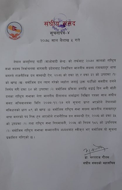 काडमाडौं। गृहमन्त्री रामबहादुर थापा ‘बादल’को सांसद पद गएको छ । यससँगै अब उनको गृहमन्त्री पद पनि जानेछ । नेकपा (माओवादी केन्द्र) ले बादलले दल त्याग गरेको र अहिले आफ्नो दलमा नरहेको भन्दै संसद सचिवालयलाई पत्र पठाएपछि बादलको पद रिक्त भएको हो ।