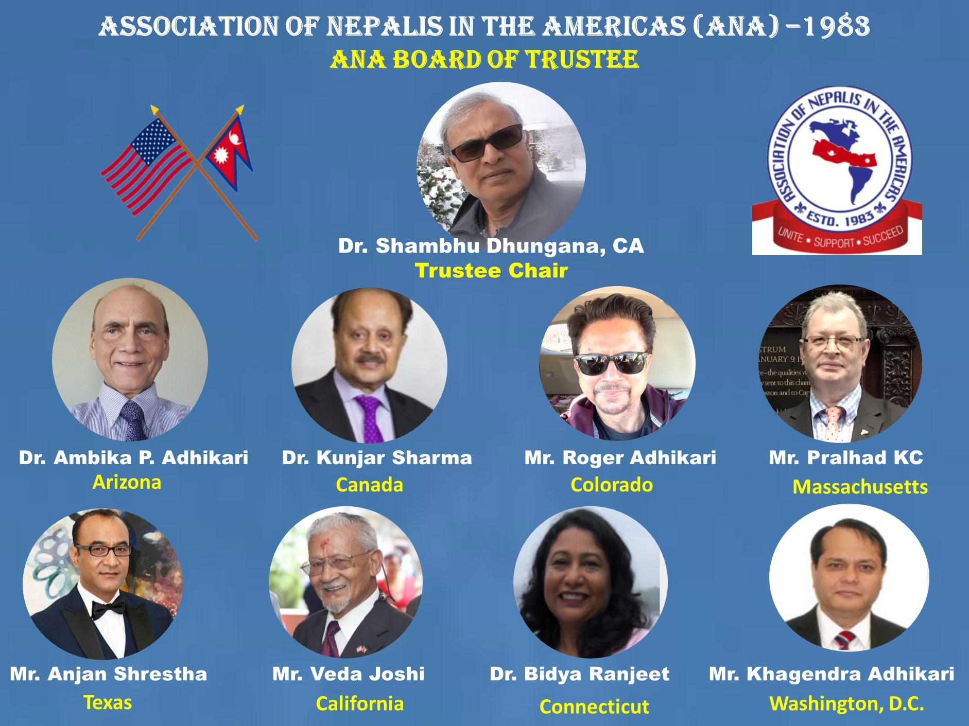 नवगठित बोर्ड अफ ट्रष्टीमा अमेरिकाका विभिन्न राज्यहरुमा नेपालीहरुका संघसंस्थाहरुको नेतृत्व गरिसकेका व्यक्तित्वहरु रहेको एएनए अध्यक्ष भट्टराईले बताए । उनका अनुसार, डा. शम्भु ढुङ्गाना – चेयर र सदस्यहरुमा डा. अम्बिका प्रसाद अधिकारी, डा. कुञ्जर शर्मा, रोजर अधिकारी, प्रहलाद के.सी, अन्जन श्रेष्ठ, बेदा जोशी, डा. विद्या रञ्जित र खगेन्द्र अधिकारी छन् ।