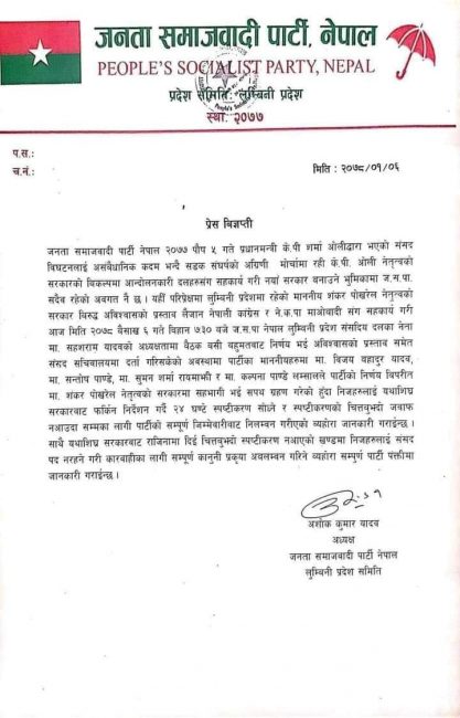 लुम्बिनीः आजै मन्त्री बनेकाहरुलाई राजीनामा दिन जसपाको निर्देशन, नत्र सांसद पद खारेज गरिने चेतावनी