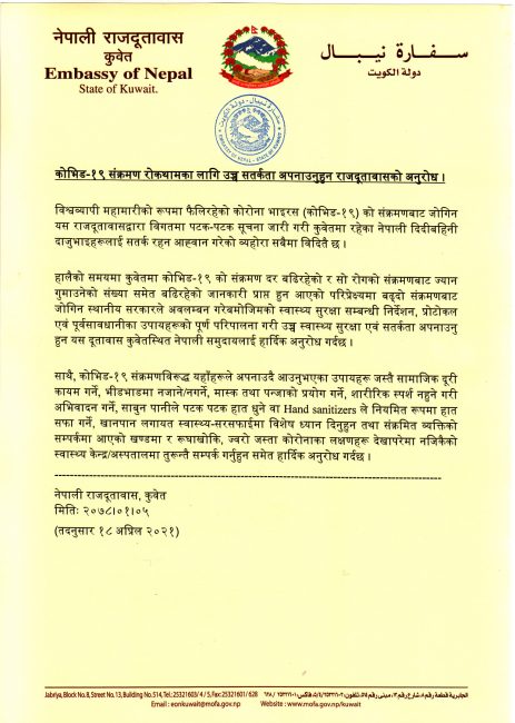 दूतावासले सूचनामार्फत त्यहाँ रहेका नेपाली समुदायलाई कुवेत सरकारले जारी गरेको स्वास्थ्य सुरक्षा सम्बन्धी निर्देशन, प्रोटोकल एवं पूर्वसावधानीका उपायहरूको पूर्ण पालना गरी उच्च स्वास्थ्य सुरक्षा सतर्कता अपनाउनसमेत अनुरोध गरेको छ ।