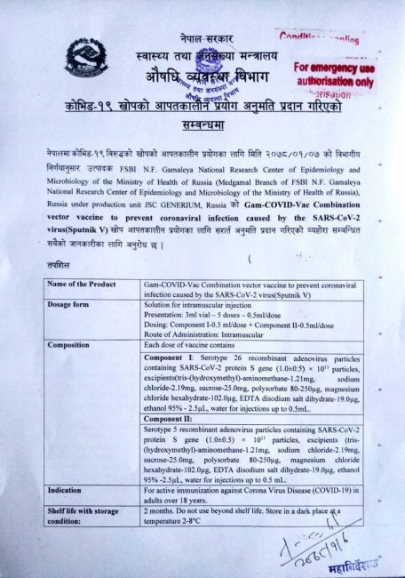 कोरोनाविरुद्धको रुसी खोपलाई पनि नेपालमा अनुमति