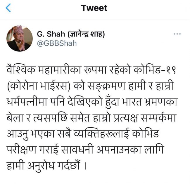 आफूसँग भारत र नेपालमा सम्पर्कमा आएकाहरुलाई कोरोना परीक्षण गराउन पूर्वराजाको आग्रह