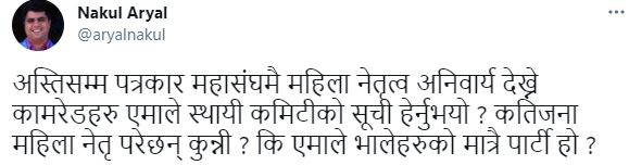 उता पत्रकार महासंघका पूर्व केन्द्रीय सदस्य नकुल अर्यालले ट्वीटरमा लेखेका छन्, ‘अस्तिसम्म पत्रकार महासंघमै महिला नेतृत्व अनिवार्य देख्ने कामरेडहरु एमाले स्थायी कमिटीको सूची हेर्नुभयो? कतिजना महिला नेतृ परेछन् कुन्नी ? कि एमाले भालेहरुको मात्रै पार्टी हो ?’