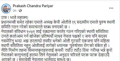 मुलुकै सत्तारुढ दलमा सहमावेशिताको यो दयनीय अवस्था आएपछि सामाजिक सञ्जालमा एमालेको आलोचना भइरहेको छ। पत्रकार तथा साझाविवेकशील पार्टीका नेता प्रकाशचन्द्र परियारले फेसबुकमा लेखेका छन्, ‘उफ, भाले महात्म्यः प्रधानमन्त्री समेत रहेका एमाले अध्यक्ष केपी ओलीले १९ सदस्यीय एमाले पुरुष स्थायी समिति गठन गरेको समाचारले स्तब्ध बनाएको छ। नेपालको संविधान २०७२ लाई रछ्यानमा फालेर गठन गरिएको स्थायी समितिमा उनले कत्लेआम गर्न खोजेका प्रतिष्पर्धी माधव नेपाल पक्षको १ जना पनि सदस्य नसमेटिनुभन्दा अझ डरलाग्दो तस्वीर भनेको ओली गुटवाटै एकजना पनि महिला स्थायी समितिमा नहुनु ओलीलाई लागेको भयानक ‘पुरुषोत्तम रोग’को संकेत हो। नीति निर्माण तहमा सिमान्तकृतहरुलाई कसरी ‘ट्याँउ ट्याँउ ठिस’ गरीन्छ भन्ने कुरो नेपालको कानुनलाई हातमा लिने नेतृत्वको अनुदार चरित्रले पटक पटक देखाउदै आएको छ। समावेशी नेपालमा भालेवाद सम्भव छ।’