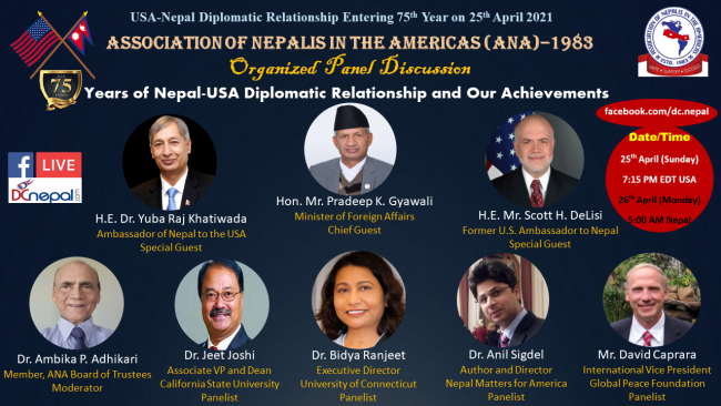 कार्यक्रममा अमेरिका–नेपाल सम्बन्धमा बिशेष जानकारी राख्नुहुने व्यक्तित्वहरु डा जीत जोशी, डा अनिल सिग्देल, डा. विद्या रञ्जित र डेभिड कप्रारा प्यानालिष्ट हुनुहुन्छ भने कार्यक्रमको संचालन ए.एन.ए. बोर्ड अफ ट्रष्टी डा. अम्बिकाप्रसाद अधिकारीले गर्नुहुनेछ । भर्चुवल प्रबिधिमार्फत आयोजित यस प्रकारको यो निकै ठूलो कार्यक्रम हो ।