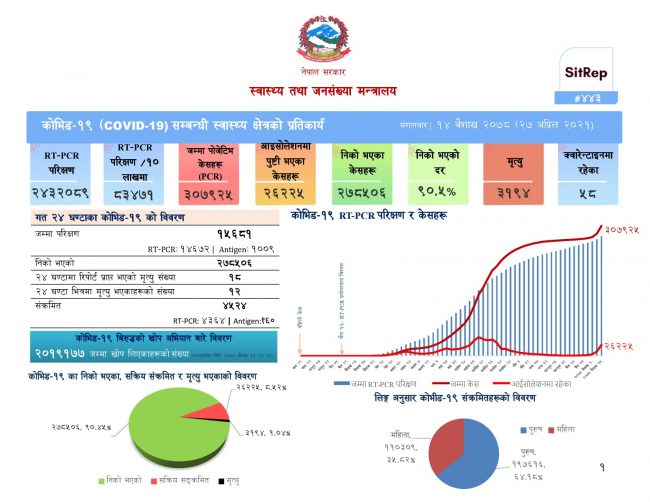 स्वास्थ्य तथा जनसंख्या मन्त्रालयका अनुसार पछिल्लो २४ घण्टामा १५ हजार ६८१ नमूना परिक्षण गर्दा ४ हजार ५२४ जनामा कोरोना संक्रमण पुष्टि भएको छ। यो अवधिमा थप ५५५ जना संक्रमणमुक्त भएको स्वास्थ्य मन्त्रालयले जनाएको छ ।
