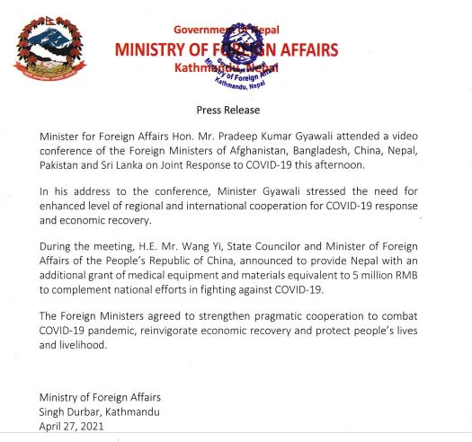 बैठकमा सहभागी नेपालका परराष्ट्र मन्त्री प्रदीपकुमार ज्ञवालीले सबै मिलेर कोरोनाविरुद्ध लड्नुपर्ने बताएका थिए। छलफलका क्रममा चिनियाँ विदेशमन्त्री यीले चीनले नेपाललाई थप सहयोग गर्ने बचन दिएका थिए।