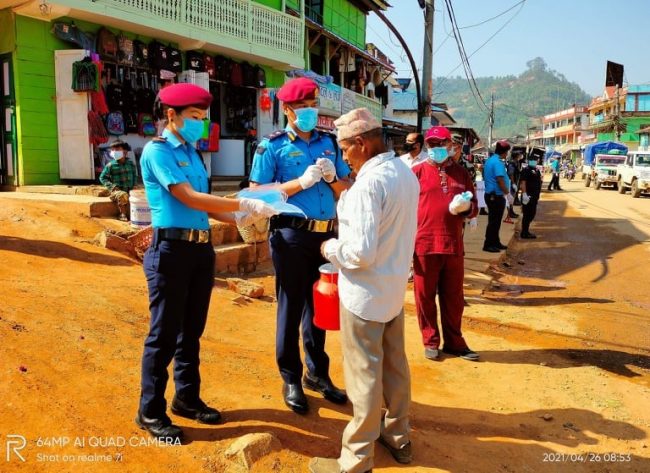 प्रहरीले व्यानरसहित ठाउँठाउँमा प्रदर्शन नै गरेर सचेतना फैलाउने प्रयास गरिरहेको छ । कुनै जिल्लामा ‘तपाईको मास्क खोइ ?’ भनेर सर्वसाधारणलाई झकझक्याउने प्रयास पनि प्रहरीले गरिरहेको छ । यस्तै मास्क वितरण गर्ने । मास्कको सही प्रयोग र मास्कलगाउन सिकाउने काम पनि प्रहरीद्वारा भइरहेको छ । त्यसका अलावमा सरकारको आदेश पालना गराउन टोलटोलमा खटिएर प्रहरीले आफ्नो भूमिका बढाउन थालेको छ