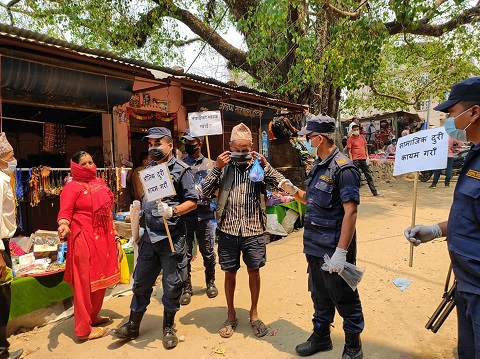 फैलिँदै गरेको कोभिड–१९ को सङ्क्रमण रोक्न सरकारले गरेको आदेशानुसार प्रहरी मानिसको भीडभाड रोक्न र स्वास्थ्य मापदण्ड पालना गराउनतर्फ केन्द्रित भएको नेपाल प्रहरीका प्रवक्ता वसन्तबहादुर कुँवरले बताए। सरकारले यही वैशाख ६ गते कोभिड–१९ नियन्त्रणका लागि विभिन्न आदेश जारी गर्दै मुलुकभर सावधानी अपनाउन सर्वसाधारणमा अपिल गरेको थियो । मुख्य गरी शहरी क्षेत्रका महानगर, नगरपालिकामा भर्चुअल कक्षा चलाउने, सिनेमा हलजस्ता भीडभाड हुने क्षेत्र वैशाखभर बन्द गर्ने, विवाहजस्ता कार्यमा २५ भन्दा बढी सहभागी हुन नपाउने, होटल रेष्टुराँ बिहान ८ देखि राति ८ बजेसम्म मात्रै चलाउन पाइने, गाडीमा सिट क्षमताअनुसार मात्रै यात्रु राख्न पाइने र सबै स्वास्थ्यका मापदण्ड पालना गर्नुपर्नेलगायतका निर्णय गरेको थियो तर अहिले सङ्क्रमण अझ बढेपछि परीक्षासमेत स्थगित गरिएको छ भने जिल्ला जिल्लाले आवश्यकतानुसार निषेधाज्ञा जारी गरिसकेको छ । उपत्यकामा यही १६ गतेदेखि निषेधको आदेश लागू हुँदैछ । त्यसमा अत्यावश्यकबाहेकका गतिविधिमा रोक लगाइएको छ ।