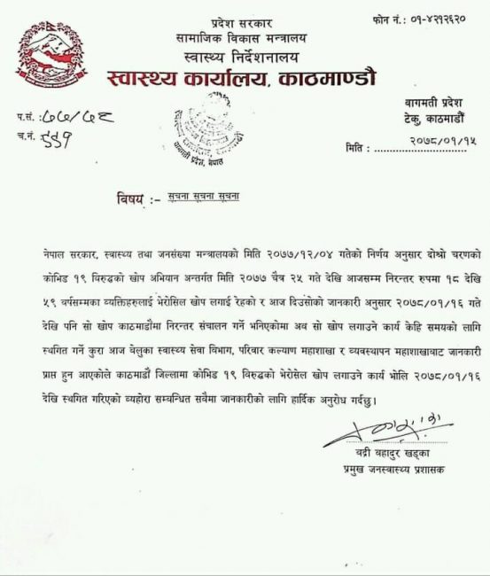 काठमाडौं। सरकारले चीनबाट प्राप्त कोरोना भाइरसविरुद्धको खोप लगाउने अभियान स्थगित गरेको छ। बिहीबारदेखि लागु हुनेगरी चिनियाँ खोप भेरोसेल लगाउने कार्य अर्को सूचना जारी नहुँदासम्मका लागि स्थगित भएको जिल्ला जनस्वास्थ्य कार्यालयले जनाएको छ।