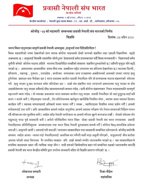 संघका केन्द्रीय अध्यक्ष लोकनाथ भण्डारी र महासचिब टीका पौडेलद्वारा संयुक्त हस्ताक्षरित विज्ञप्तिमा भनिएको छ, “यातायात ब्यबसायीहरु तथा ब्यबसायी सम्बन्धित एजेन्टहरूले कोभीड़ प्रकोपकै समयमा स्वदेश आवत –जावत गर्दा नेपालीहरुलाई अत्यधिक मार पर्नेगरी चर्को भाड़ा असुली गरिएको, यात्रुहरुलाई बीच बाटोमा अलपत्र पारेको जस्ता बिगतका गैरमानवीय ब्यबहारप्रति संघको गम्भीर ध्यानाकर्षण भएको छ । बस ब्यबसायीहरूले मानबीय सदासयता प्रकट गर्दै न्यायिक भाड़ा लिन र यात्रीहरूको जिम्मेवारी बहन गर्न सम्बन्धित पक्षको ध्यानाकर्षण गराउदछौ ।”संघले भारतमा रहने सम्पुर्ण प्रवासी नेपाली आमाबुवा ,दाजुभाइ तथा दिदीबहिनीहरुलाई बिव महामारीको रुपमा देखापरेको प्राण घातक कोरोना भाइरसको दोस्रो चरणको लहर तीब्र गतिमा बढेको र यसले संक्रमितको संख्या धेरै बढेकोले सजग र सतर्क रहन अपीलसमेत गरेको छ । भनेको छ, ‘आफुलाई बिश्वकै महाशक्ति सोच्ने ठूला देशहरुलाई समेत हायलकायल पार्दै बिश्व मानबजाति र विज्ञानलाई समेत चुनौती बनेको कोरोना भाइरस अहिले भारतमा दिनप्रतिदिन लाखौंको संख्यामा संक्रमित हुनथालेकोले आम नेपालीहरुलाई सजग भइरहन हार्दिक अपील गर्दछौं ।’