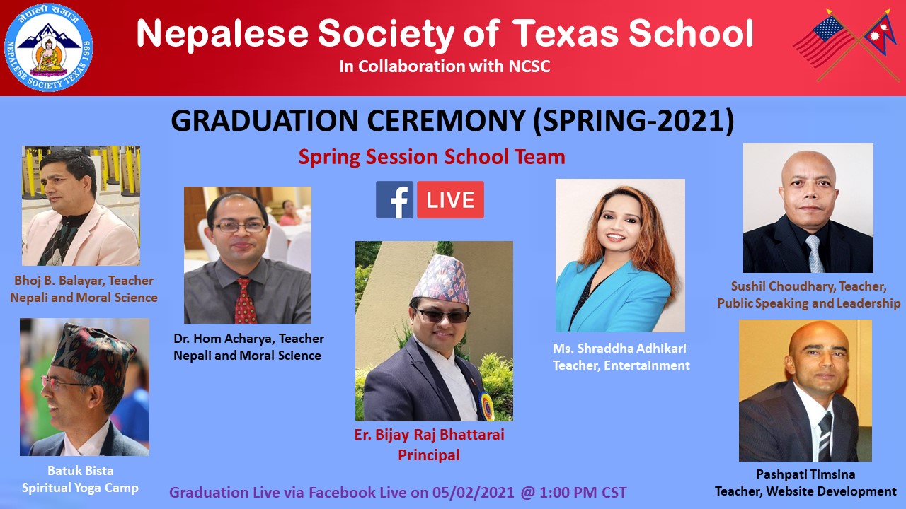 टेक्सास – सम्भवत: संसारमै नेपाल बाहिर रहेका नेपालीहरु द्वारा संचालित सवैभन्दा ठूलो स्कूलको आउदो आइतबार मे २ दिउसो १ बजेबाट दीक्षान्त समारोहको आयोजना गरिएको छ।