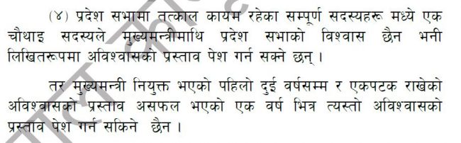 यस्तो अवस्थामा धारा १६८ (१) अनुसार नियुक्त मुख्यमन्त्रीलाई हटाउने विधि भनेकै अविश्वासको प्रस्ताव ल्याउने हो । तर, अब शंकर पोखरेल मुख्यमन्त्री भए भने संवैधानिक व्यवस्थाअनुसार २ वर्षसम्म उनीविरुद्ध अविश्वासको प्रस्ताव ल्याउन पाइँदैन । संविधानको धारा १८८ (४) मा भएको व्यवस्था अनुसार मुख्यमन्त्री नियुक्त भएको पहिलो २ वर्ष अविश्वासको प्रस्ताव ल्याउन पाइँदैन । यसको अर्थ अबको २ वर्षसम्म पोखरेलविरुद्ध अविश्वासको प्रस्ताव ल्याउनु असंवैधानिक हुनेछ ।