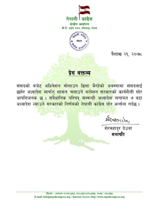 उनका अनुसार बैठकको कार्यसूची नै तोकेर संसदको अधिवेशन आव्हान गरिएकोमा समेत काँग्रेस असन्तुष्टि पोखेको छ।