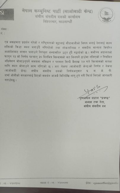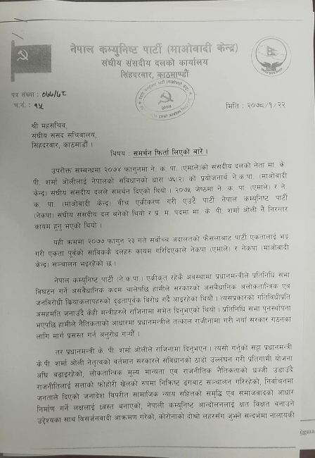 समर्थन फिर्ताको पत्र बुधबार बिहान संसद सचिवालयमा बुझाइएको छ। माओवादी केन्द्रका प्रमुख सचेतक देव गुरुङले संसद सचिवालयका सचिव गोपालनाथ योगीलाई पत्र बुझाएका छन्।