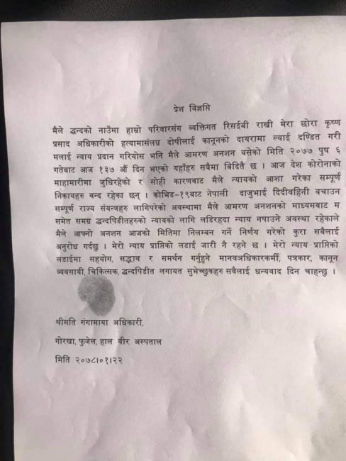 गंगामायाले छोरा कृष्णप्रसादका हत्यारालाई कारबाही गर्नुपर्ने भन्दै पटक पटक अनसन बस्दै आएकी छन्। उनले बुधबार एक विज्ञप्ति जारी गर्दै देशमा कोरोना महामारी बढेको भन्दै अनसन तोडेकी हुन्। उनले छोराको न्यायाको लडाइँ भने जारी रहने बताएकी छन्।