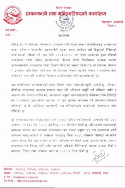 काठमाडौं। सरकारले कोरोना संक्रमितको उपचारका लागि देशभर २० हजार बेड रहेको जानकारी दिएको छ। प्रधानमन्त्री तथा मन्त्रिपरिषदको कार्यालयले बिहीबार एक विज्ञप्ति जारी गर्दै देशभरको स्वास्थ्य व्यवस्थापनको अवस्थाबारे जानकारी दिएको हो।
