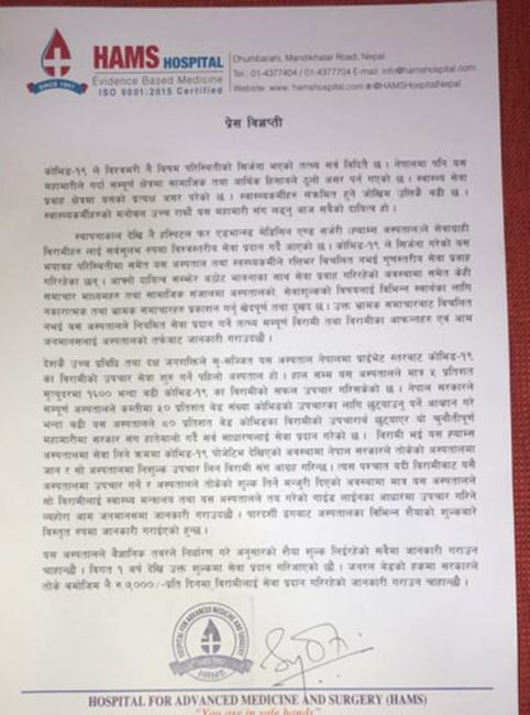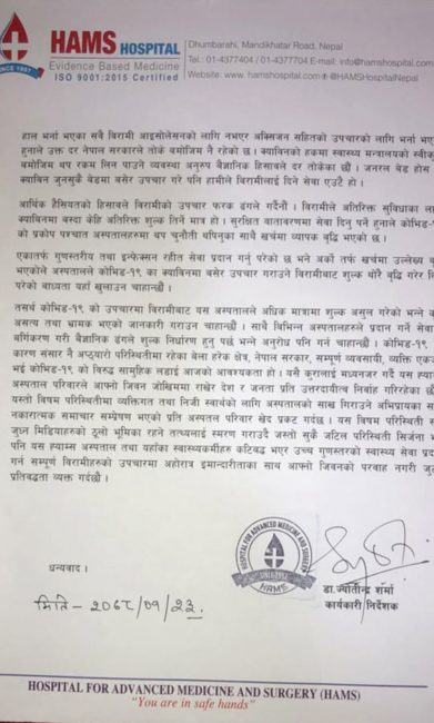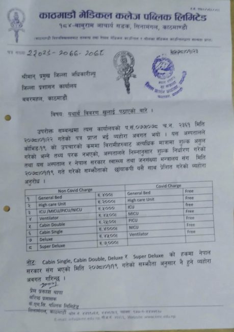 काठमाडौं। ह्याम्स अस्पताल र केएमसीले कोरोना संक्रमित विरामीसँग चर्को शुल्क असुलेको भन्दै जिल्ला प्रशासन कार्यालय काठमाडौंले सोधेको स्पष्टीकरणको जवाफ दिएका छन्। बिहीबार दुबै अस्पतालले स्पष्टीकरण दिँदै सरकारसँग भएको सम्झौताभन्दा धेरै शुल्क नलिएको दावी गरेका छन्।