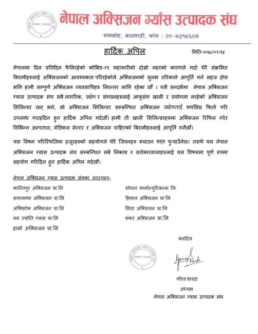 खाली सिलिण्डर तत्काल उपलब्ध गराउन अक्सिजन उत्पादक संघको सार्वजनिक अपिल