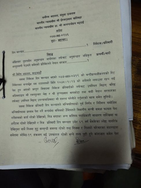 काठमाडौं। बालुवाटारको सरकारी जग्गा निजी व्यक्तिका नाममा सारेको प्रकरणमा जेलमा रहेका अख्तियार दुरुपयोग अनुसन्धान आयोगका पूर्व प्रमुख आयुक्त तथा सरकारका पूर्व सचिव दीप बस्न्यातलाई सर्वोच्च अदालतले धरौटीमा छाड्न आदेश दिएको छ।