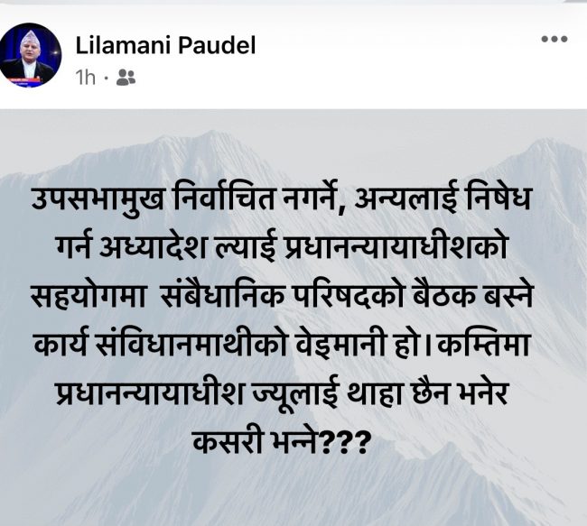 तर, प्रधानन्यायाधीश राणाका तर्फबाट कुनै भनाइ आएको छैन। त्यसैले बार महासचिब पौडेलले सामाजिक सञ्जाल फेसबुकमा लेखेका छन्, ‘उपसभामुखको निर्वाचन नगर्ने, अन्यलाई निषेध गर्न अध्यादेश ल्याई प्रधानन्यायाधीशको सहयोगमा संवैधानिक परिषदको बैठक बस्ने कार्य संविधानमाथिको बेइमानी हो। कम्तिमा प्रधानन्यायाधीश ज्युलाई थाहा छैन भनेर कसरी मान्ने?’
