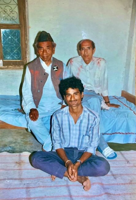 जसमा गणेशमानजी र गिरिजाबाबु तन्ना बिच्छ्याइएको खाटमा बस्नुभएको छ भने उहाँहरु दुबैको बीचमा पर्ने गरी म तल भुइँमा बसेको छु। पहिलो तस्वीरको बारेमा मैले पहिले नै डिसी नेपालमा लेखिसकेको पनि छु। त्यो गणेशमानजीको अस्थायी ट्वाइलेट अगाडिको तस्वीर हो।