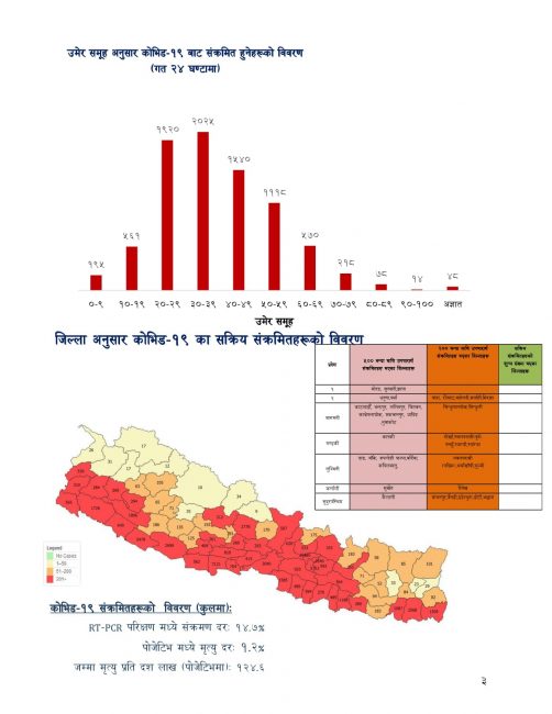 यस्तै, झापामा १५०५, मोरङमा २५६८, सुनसरीमा १०८७, धनुषामा ११८८, पर्सामा १५८५, रुपन्देहीमा ७१२१ , बाँकेमा २६९९ ,बर्दियामा ५४७८, धादिङमा ६२०, नुवाकोटमा ६३१,कास्कीका २७७८, पाल्पामा ८१८ , कैलालीमा १७२६, सुर्खेतमा १८९६, , दाङमा ५६२ , चितवनमा १५८५ , काभ्रेमा ९९२, मकवानपुरमा ९२५ र कपिलवस्तुमा २०४० जना सक्रिय संक्रमित रहेका छन् ।