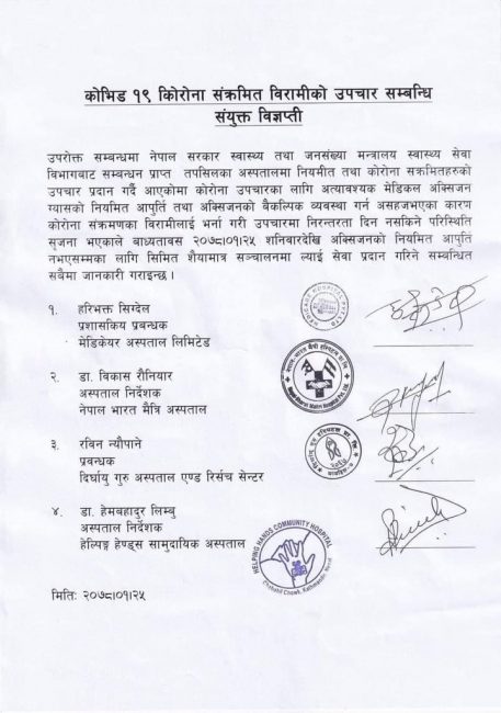 अक्सिजन अभावका कारण बिरामी भर्ना लिन नसकिने राजधानीका चार अस्पतालको घोषणा