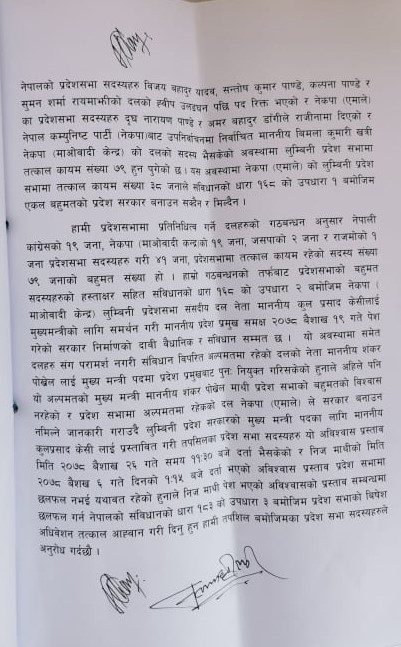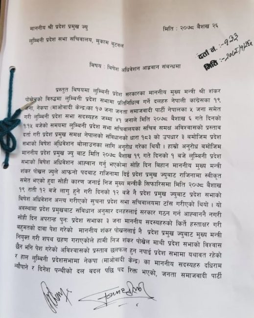 विपक्षीहरुले आइतबार अविश्वासको प्रस्ताव दर्ता गराएपछि प्रदेश प्रमुख धर्मनाथ साह समक्ष प्रदेशसभाको विशेष अधिवेशनको माग गर्दै निवेदनसमेत दिएका छन्।